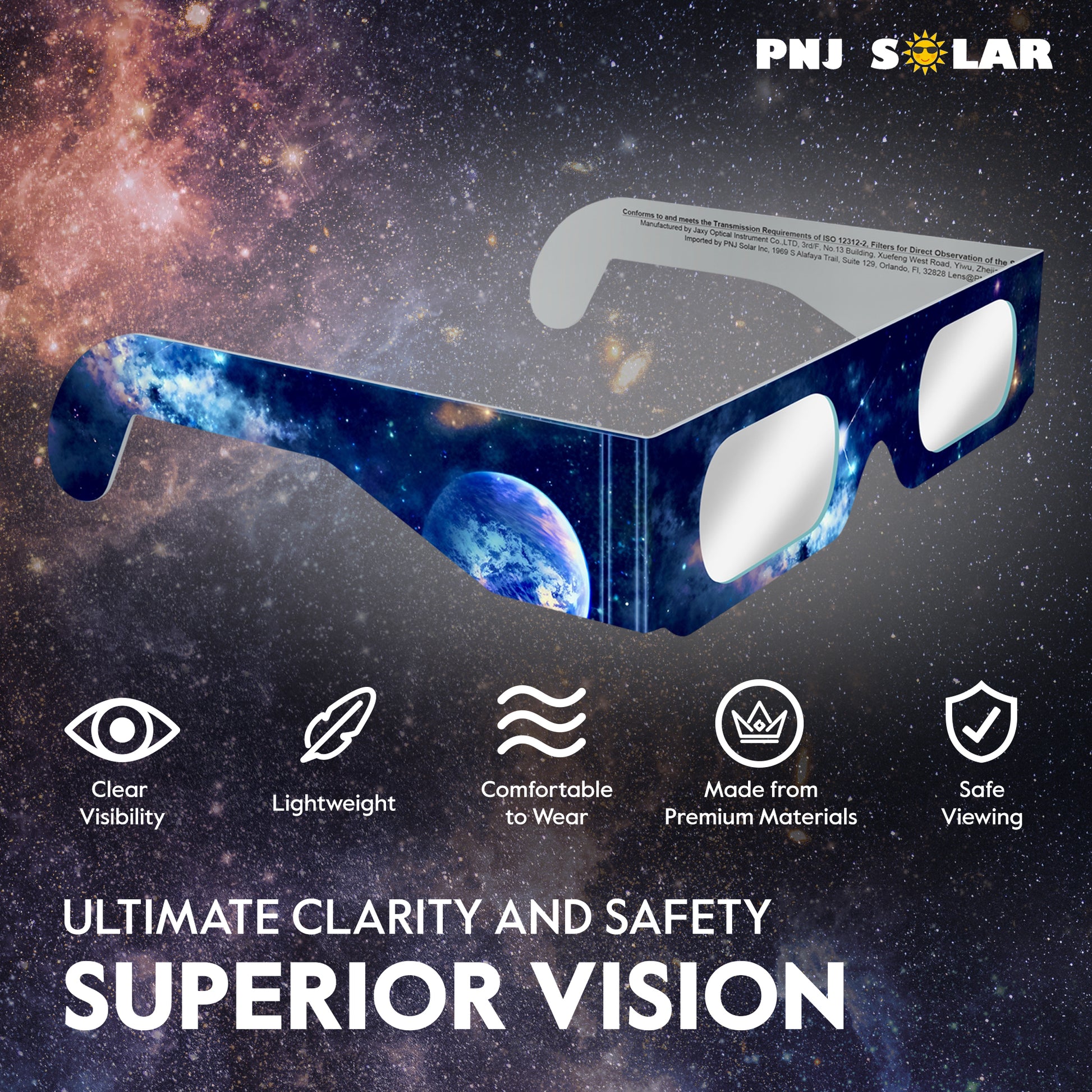 PNJ Solar glasses are recognized as ISO-compliant by the American Astronomical Society. These glasses will filter 100% of harmful ultra-violet, 100% of harmful infrared, and 99.999% of intense visible light.